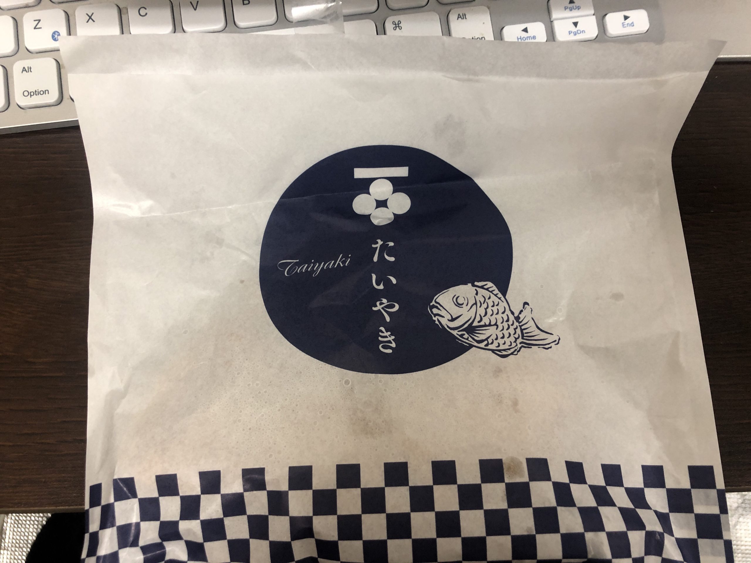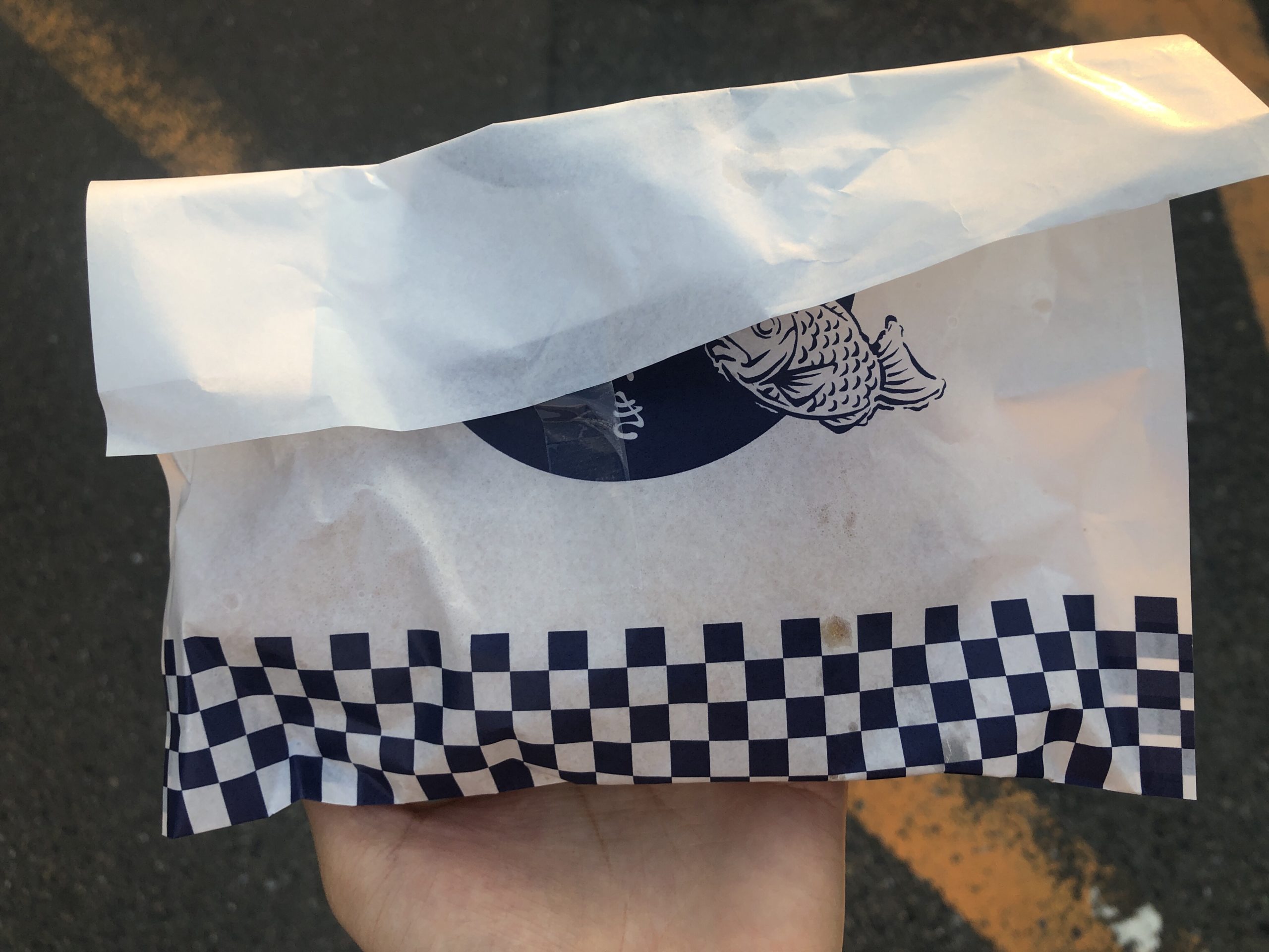 ベーコンエッグチーズたい焼きを買いました。焼きたてで熱々なのでアトリエまで持ち帰ります。