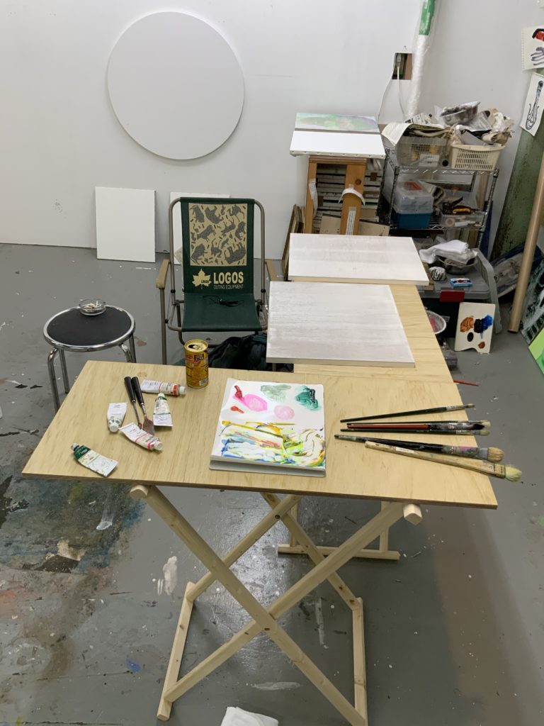 安定感ないし大きいベニヤ置きづらいし、やっぱりちゃんとしたテーブル用意しないとなあとおもったけど、床で描くよりだいぶ気分が良い感じがした。