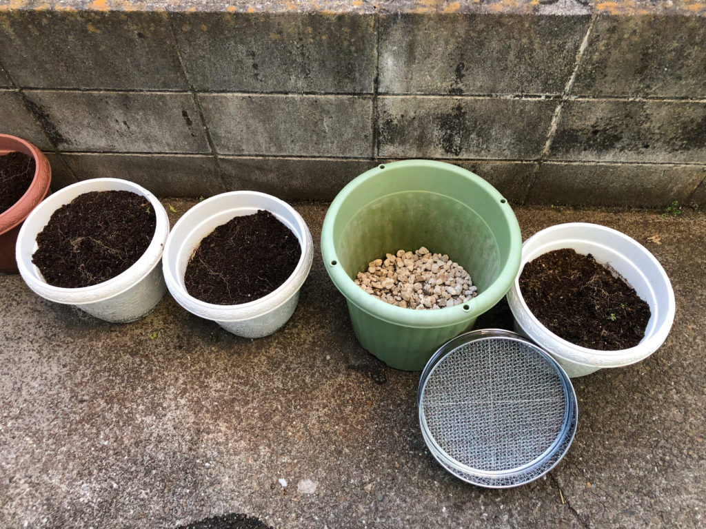 ふるいを掛けて緑のプランターに土を移し替えます。
