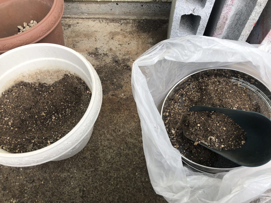 元々の土をふるいにかけて枯れてる根っこを捨ててます。