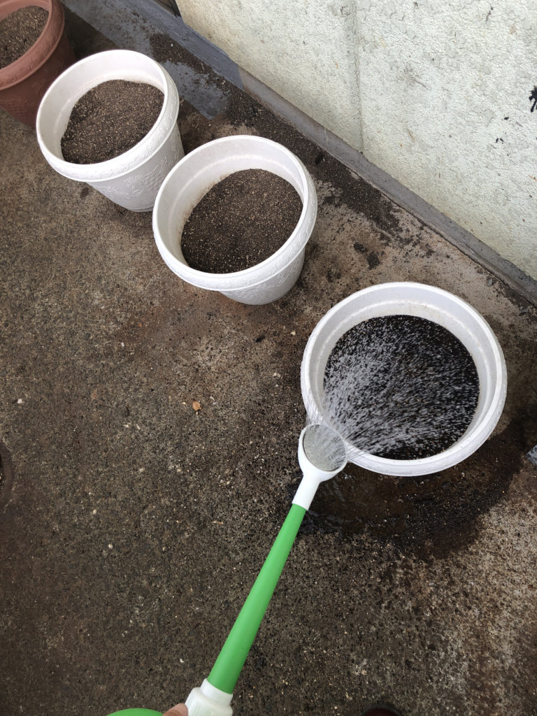 プランターに土を分けて土をアルカリ性にする苦土石灰も撒きました。このタイミングで撒いていいのかはわからないです。