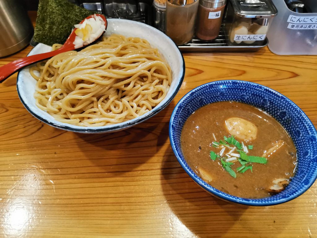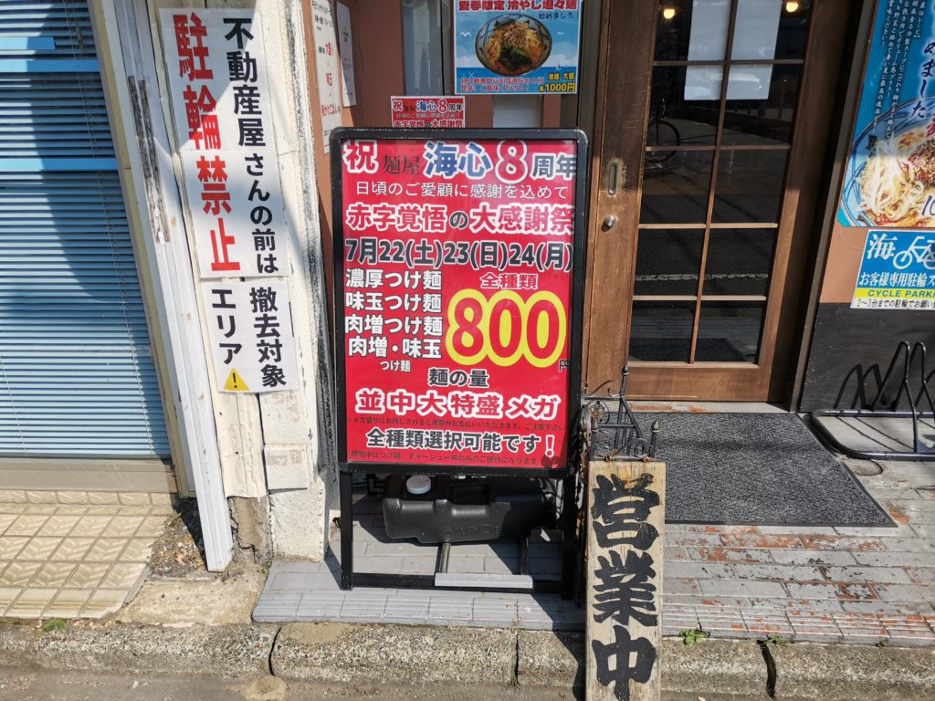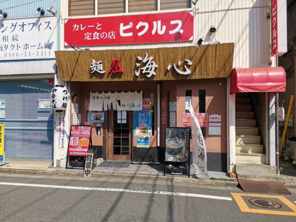 そんな暑い日でも、ラーメンを啜りたくなりますよね。今回紹介するのが、辻堂駅南口にあるラーメン屋「麺屋 海心」です。図書館の帰りに通るのでいつも気になってたんですよね。この日は8周年記念日でつけ麺が全種800円とのこと。今回はせっかくなのでフルトッピングの「肉増し・味玉つけめん」を注文。