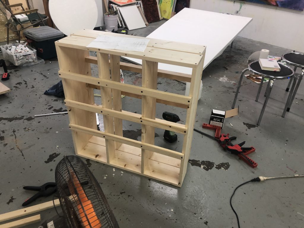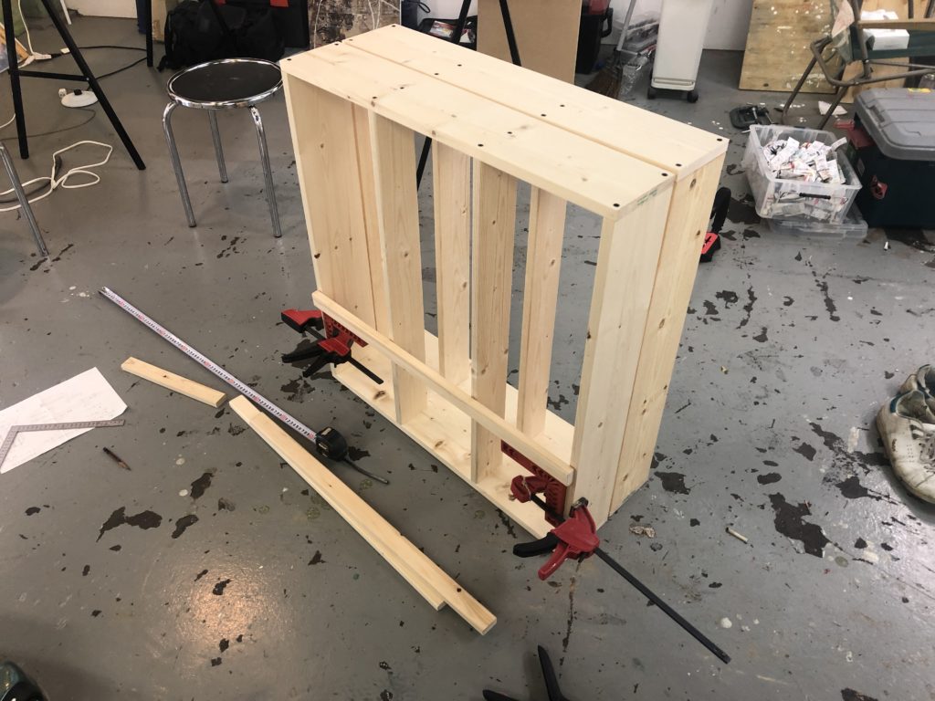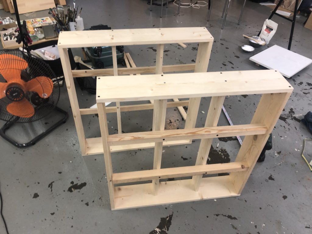 なので裏はアトリエにあった端材の垂木でやってみましたが、4段だと窮屈だなあ〜という感じ。